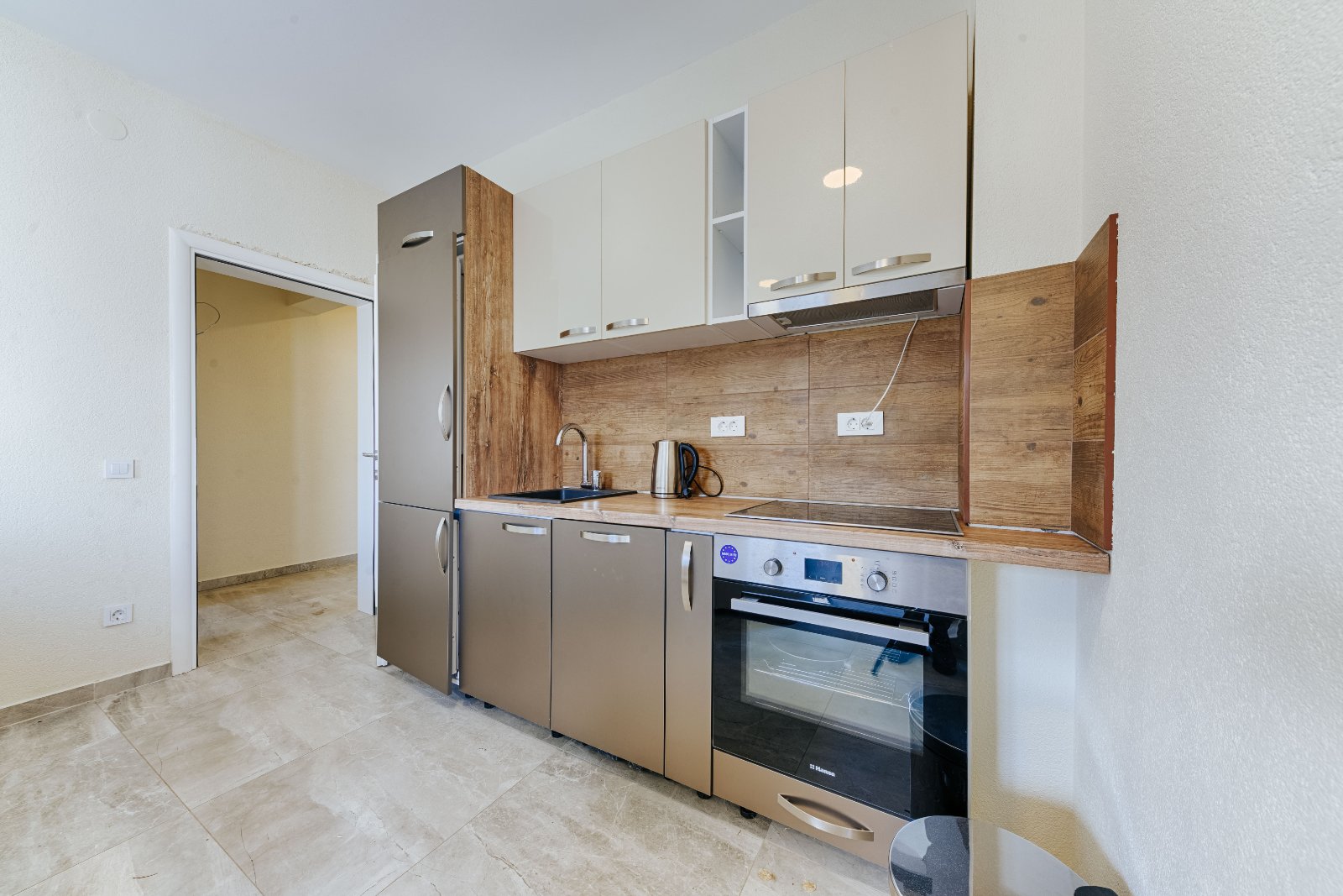 The building consists of a garage level, ground floor, and three upper floors, with a total of 12 fully functional apartments. The apartment structure includes five studio apartments, three one-bedroom apartments, and four two-bedroom apartments. Each apartment has its own bathroom, kitchen, and terrace, providing a high level of comfort and complete independence for guests or residents.