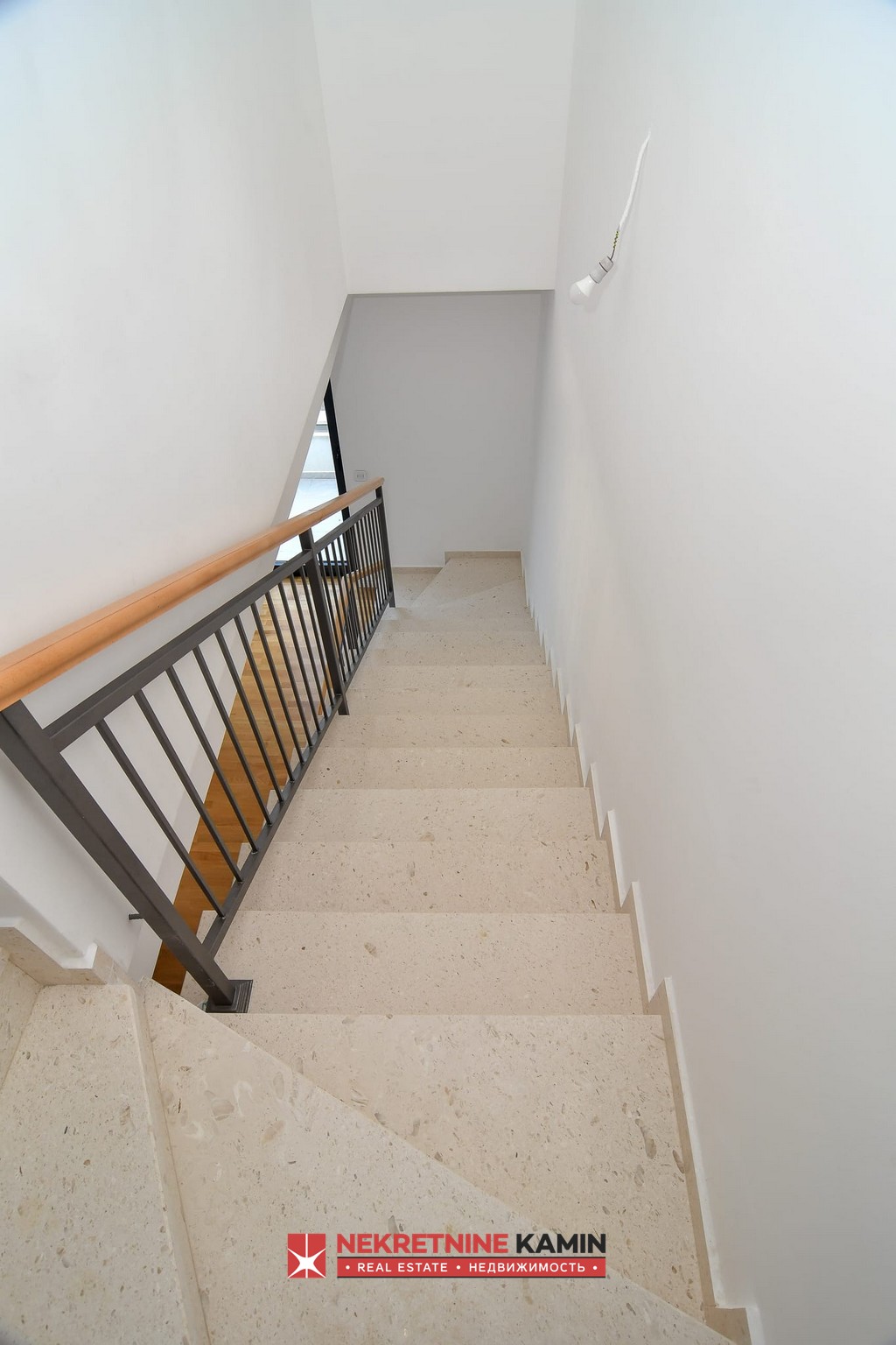 Mermerne stepenice s ogradom od kovane bravarije i drveta vode na prvi sprat, koji se prostire na 58 m². Na ovom nivou nalaze se dvije spavaće sobe s vlastitim kupatilima. Obje sobe opremljene su velikim staklenim panelima i slajd vratima te nude panoramski pogled na more. Iz veće spavaće sobe izlaz je na prostrani balkon od 8 m², dok hodnik pruža pristup manjem balkonu s pogledom na more i bazen.