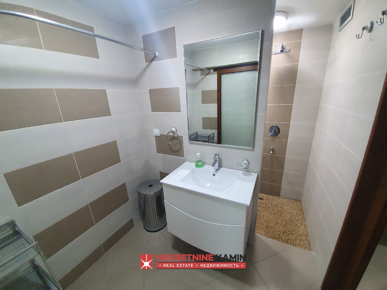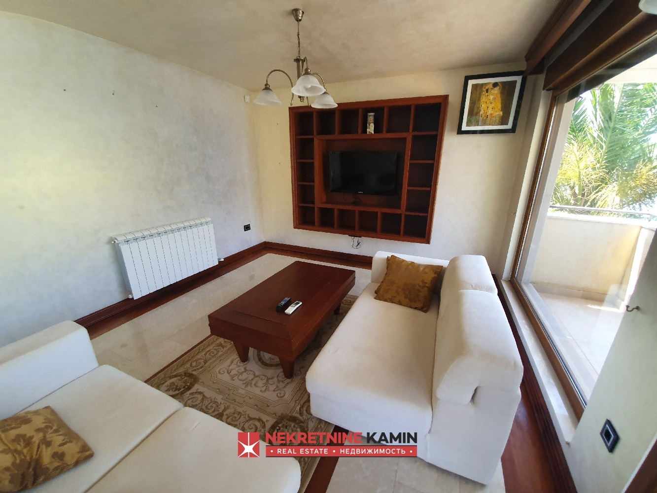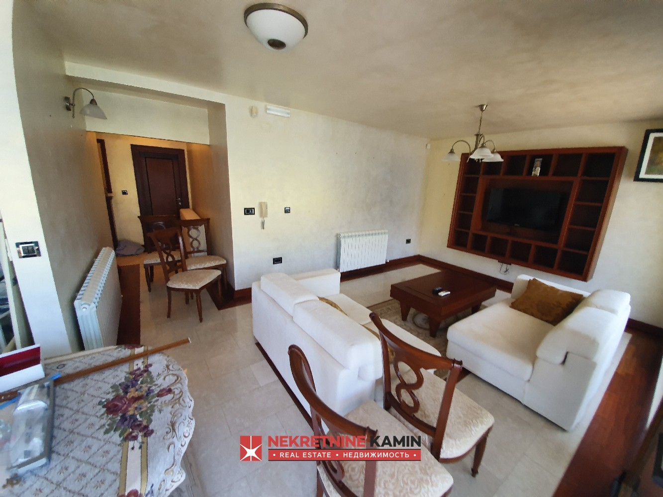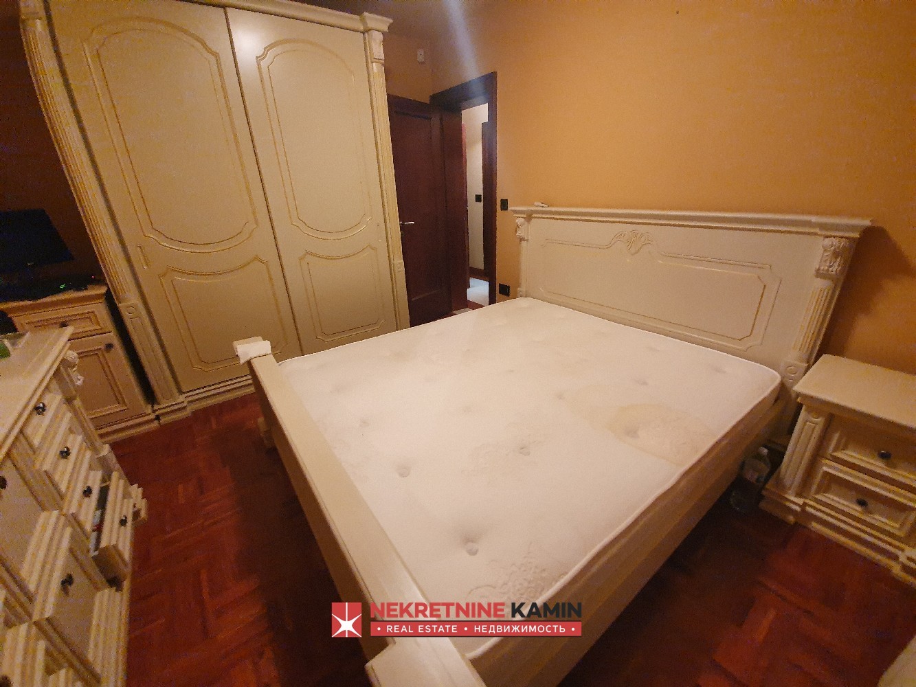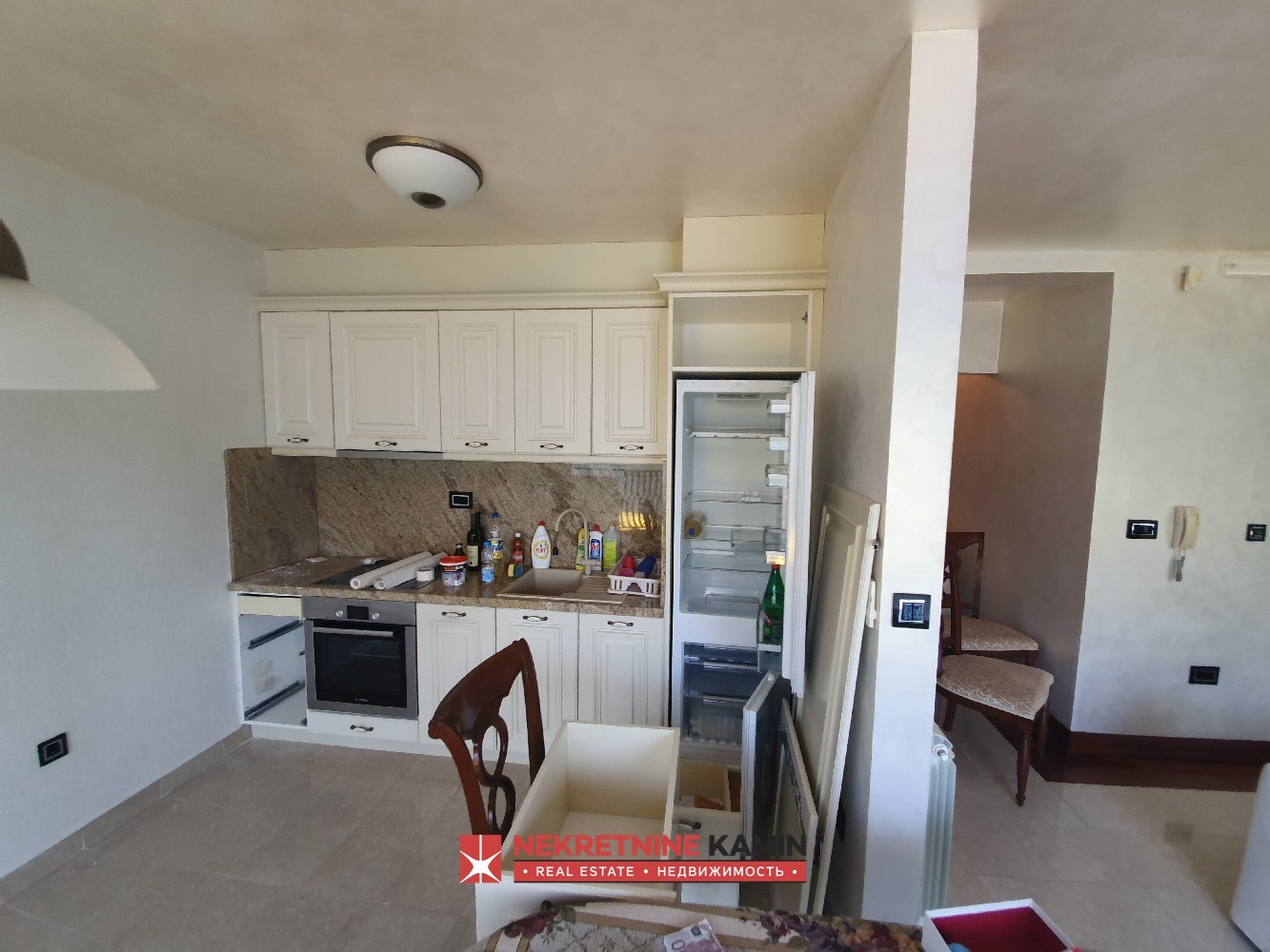 Kompletan stan je opremljen kvalitetnim namještajem po mjeri, bijelom tehnikom i pod je uradjen od mermera sa drvenim detaljima.