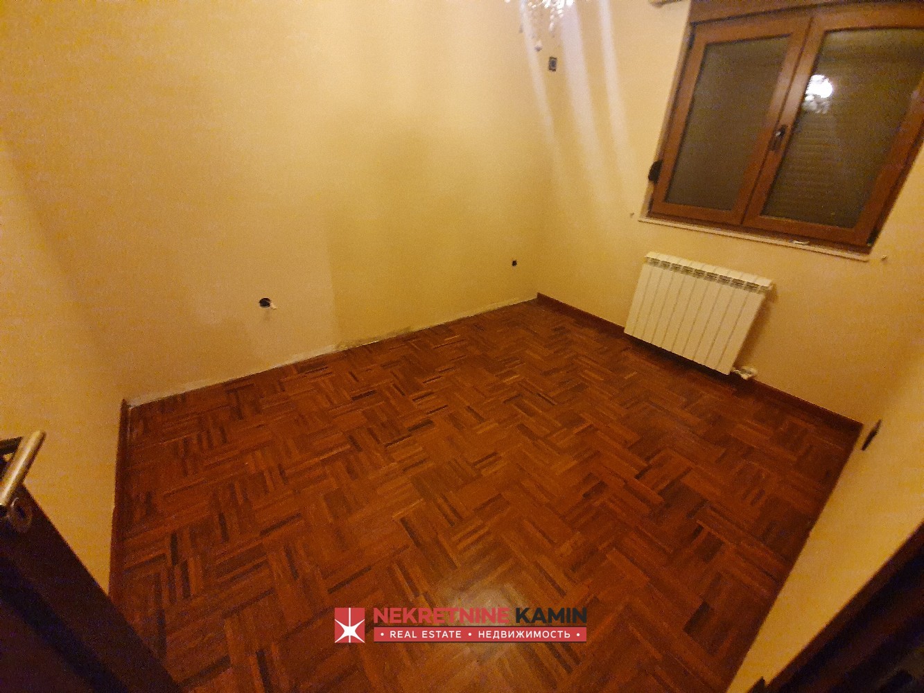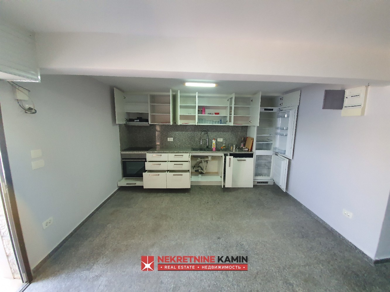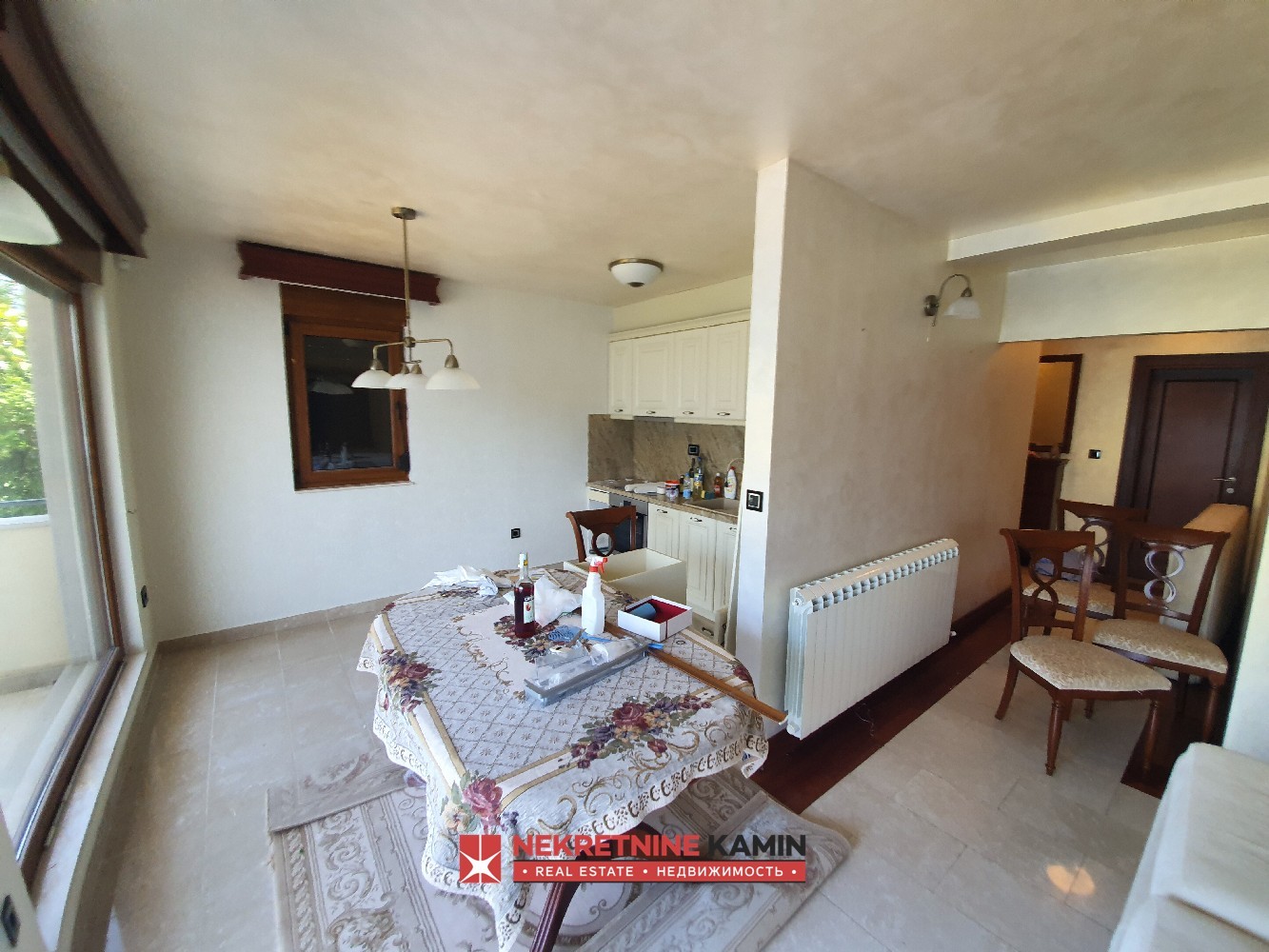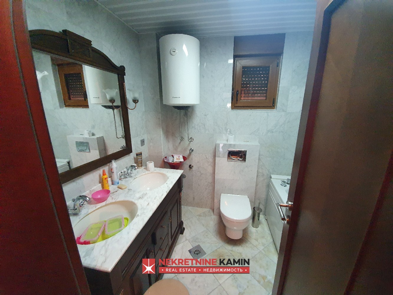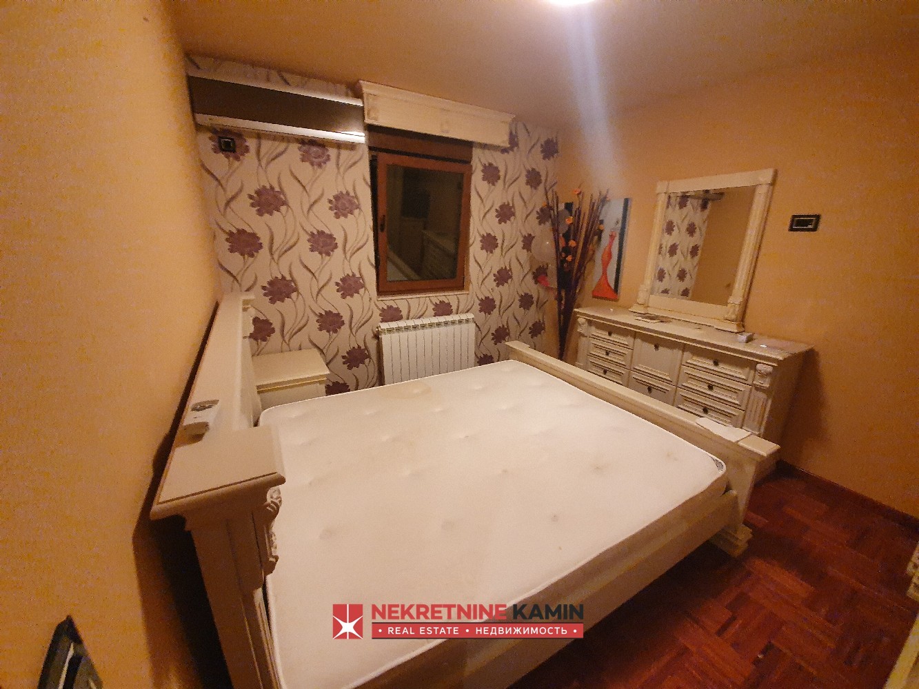 Kompletan stan je opremljen kvalitetnim namještajem po mjeri, bijelom tehnikom i pod je uradjen od mermera sa drvenim detaljima.