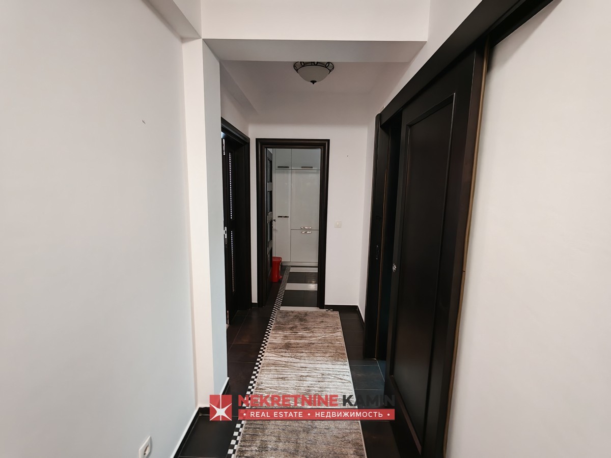 Rasporedjen je na hodnik, dnevni boravak, kuhinju, dvije spavaće sobe, dva kupatila, dvije terase sa koje se pruža pogled ka gradu I ulici.