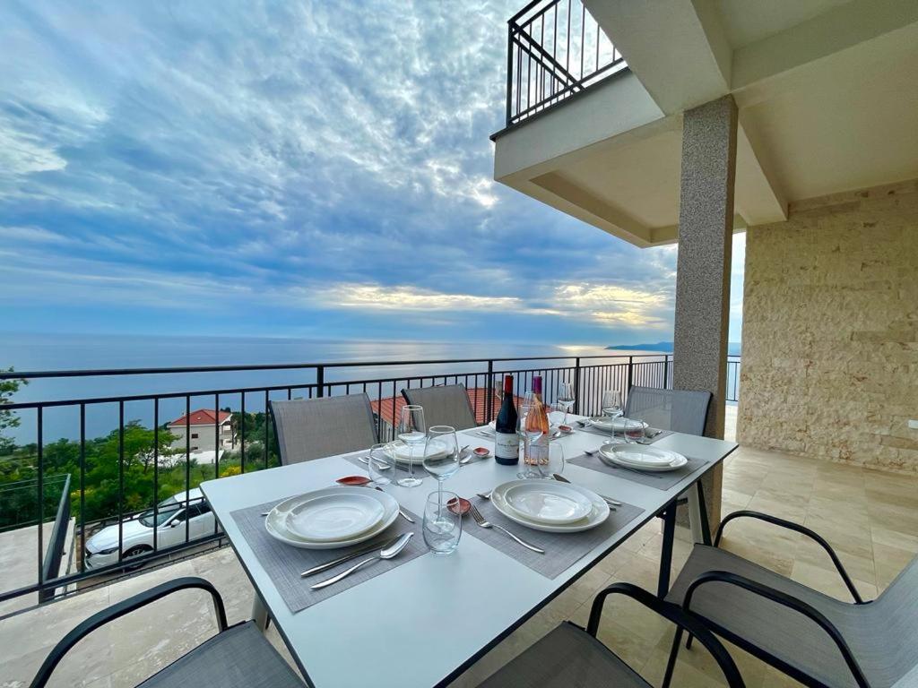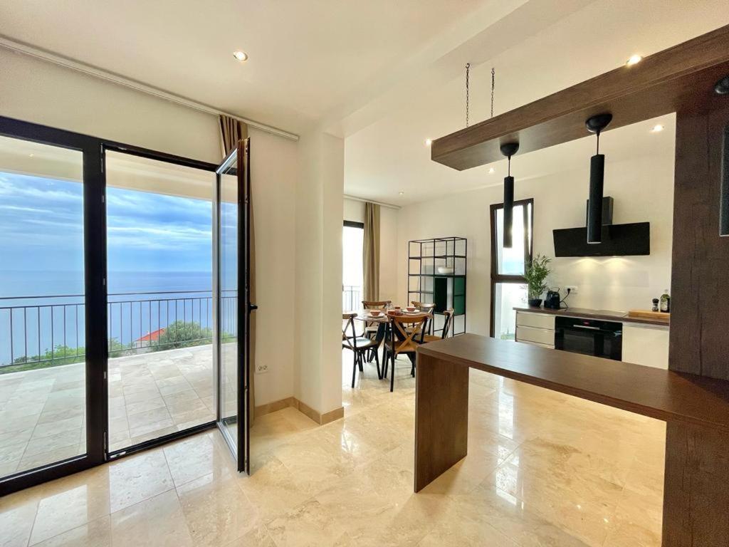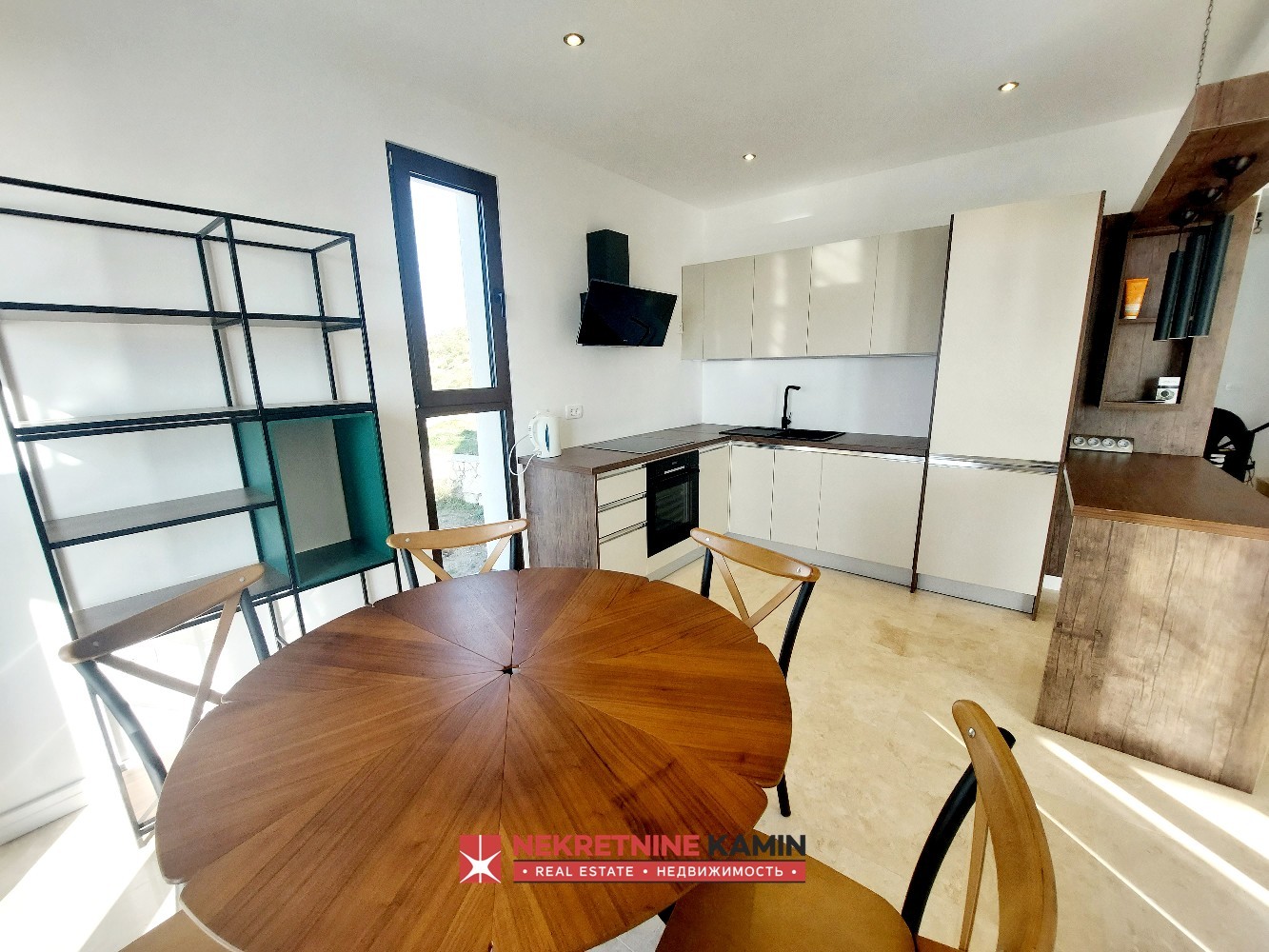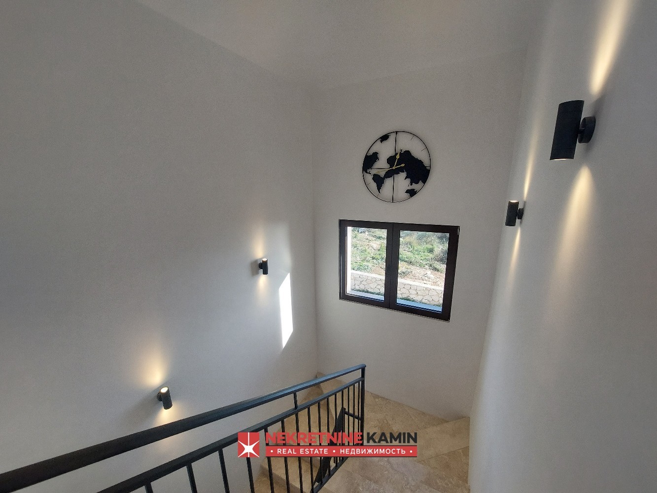 Prvi sprat čine veliki svijetli dnevni boravak, moderna kuhinja, trpezarija i široka terasa idealna za uživanje u prelijepim zalascima sunca i morskom horizontu.