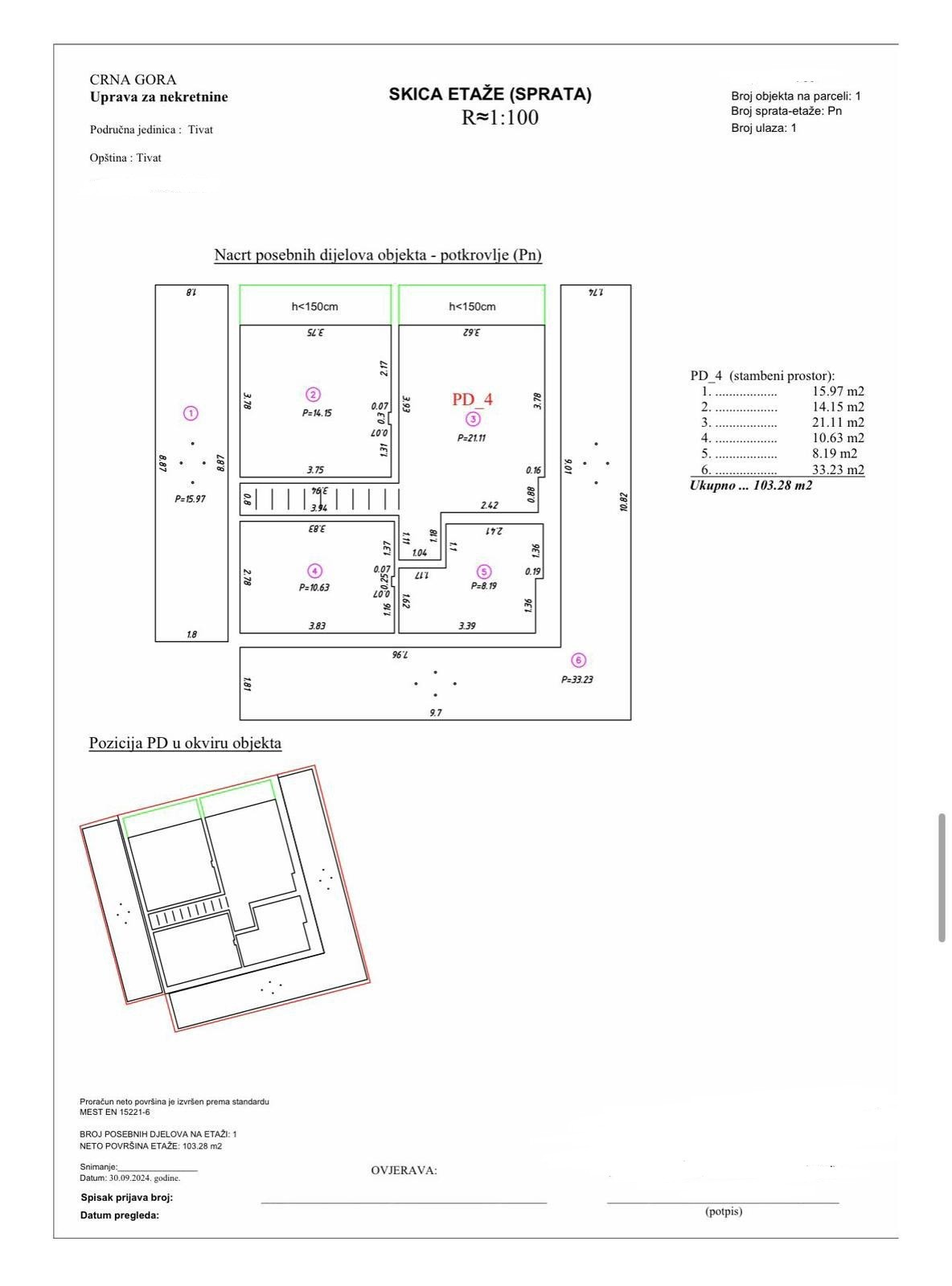 Ukupna površina iznosi 103 m² (unutrašnji prostor 55 m² + terasa 48 m²).
