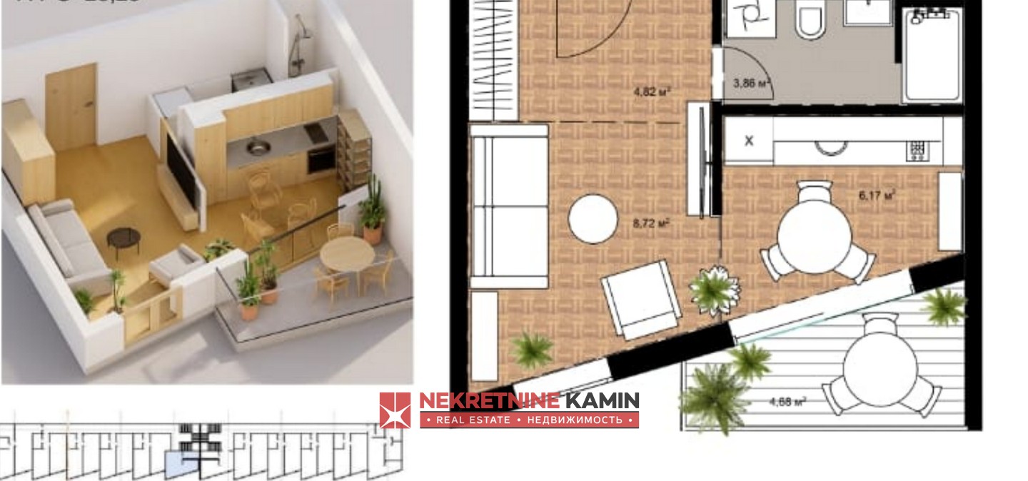 Studio apartman zauzima površinu od 28m2 i nalazi se u ovom modernom kompleksu.