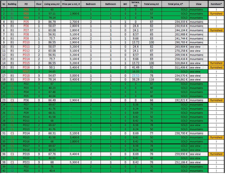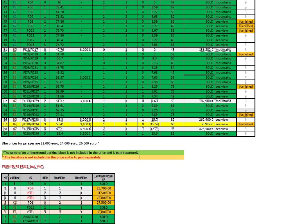 Stanovi se prodaju delimično ili potpuno opremljeni, u zavisnosti od jedinice. Troškovi održavanja iznose 2,8 € po m² mesečno.