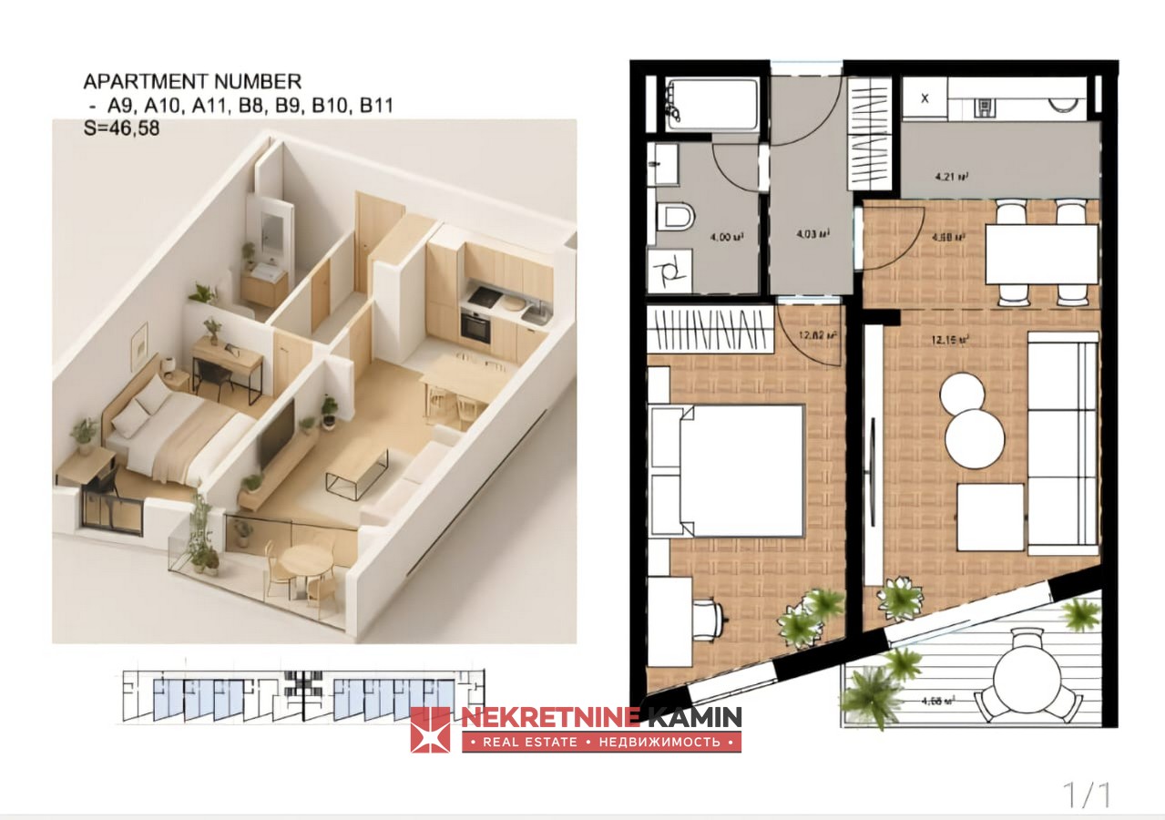 Jednosoban stan površine 46m2 pozicioniran je u ovom kompleksu I južno je orjentisan.