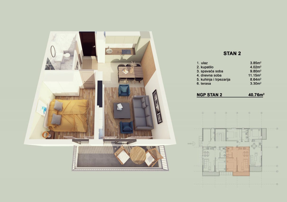 Jednosobni stanovi su površine 40.76m2 (ukupno 58m2). Cena: 142.000,00€