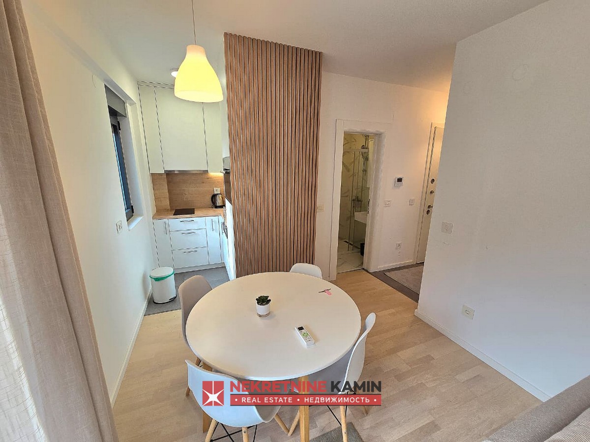 Rasporedjen je na: hodnik, dnevnu sobu sa trpezarijom, odvojenu kuhinju, spavaću sobu, kupatilo i terasu sa djelimičnim pogledom na more.