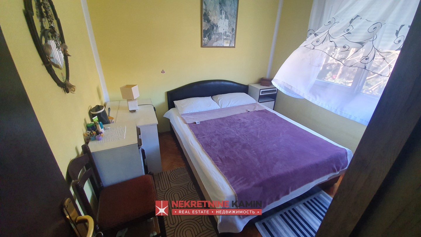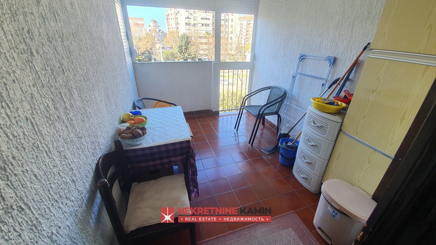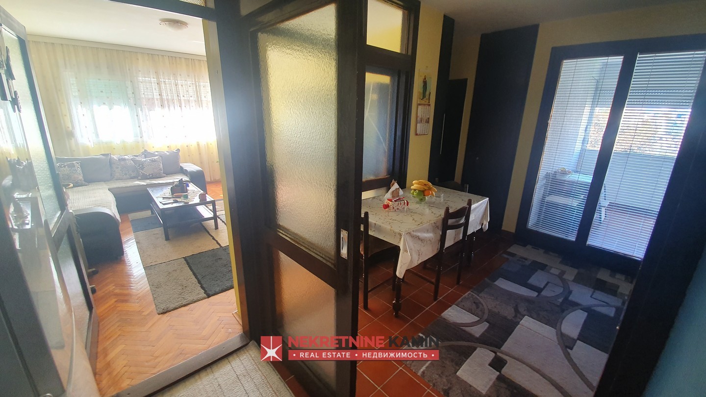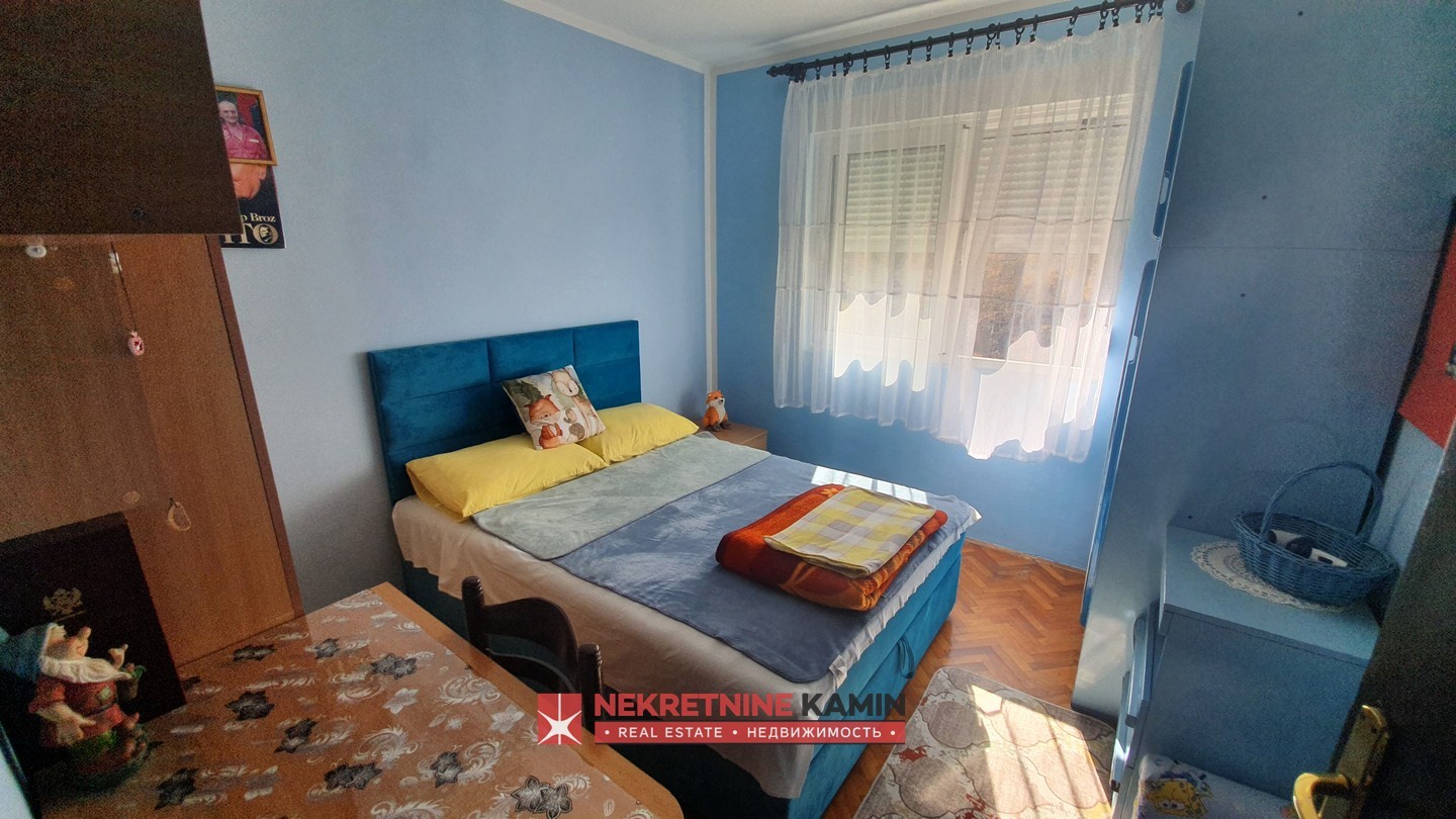 Rasporedjen je na: hodnik, dnevnu sobu, odvojenu kuhinju i trpezariju, dvije spavaće sobe, terasu i kupatilo+toalet.