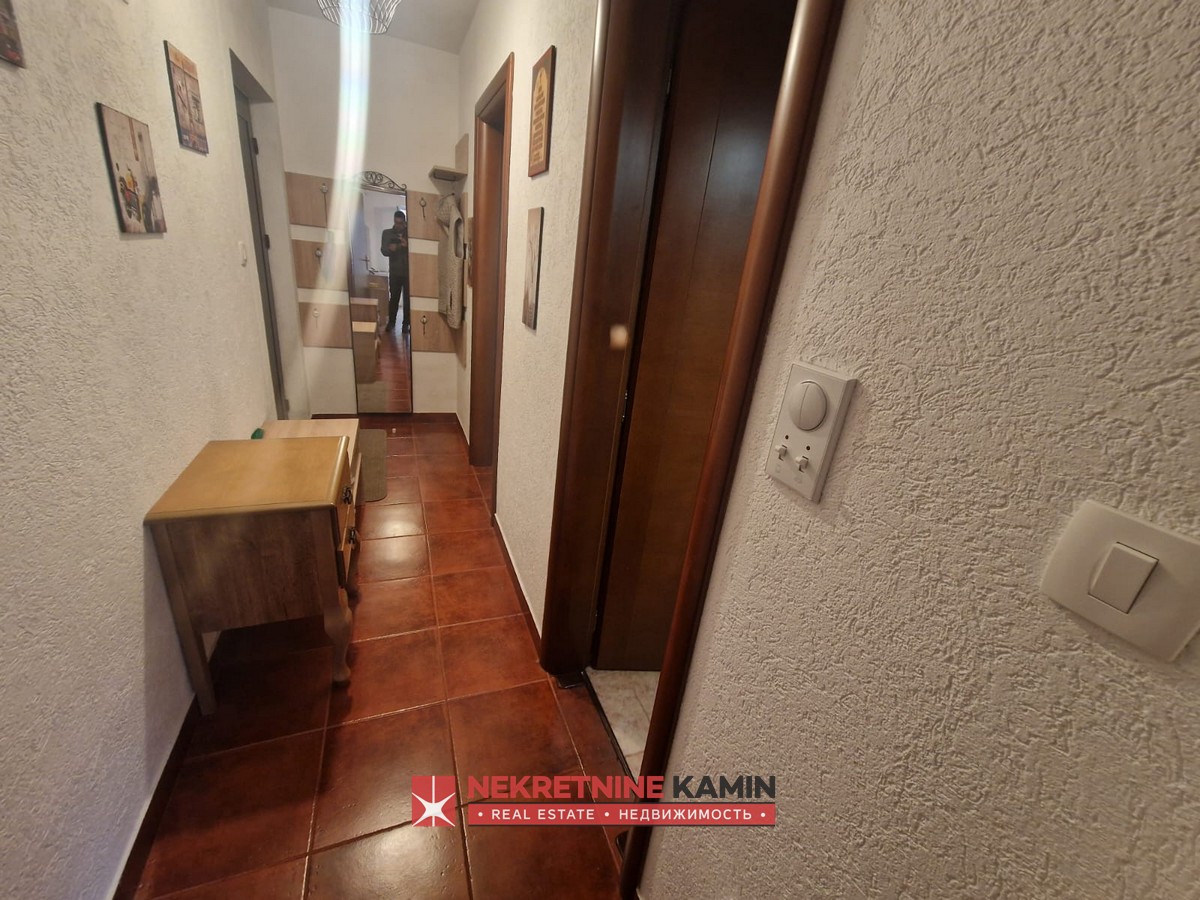 Rasporedjen je na hodnik, dnevnu sobu sa kuhinjom i trpezarijom, spavaću sobu, kupatilo i terasu.